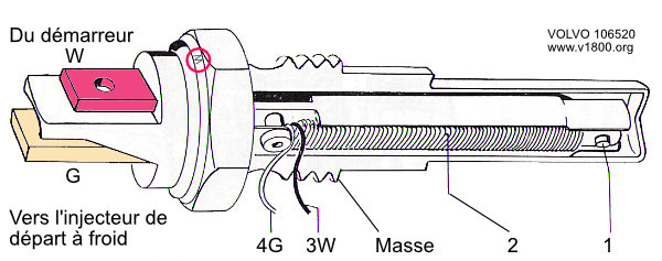 Lorsque le moteur est froid (au-dessous de +35 °C), les contacts (1) sont fermés. Lorsque le démarreur tourne, il envoie un courant à l'injecteur de départ à froid pour passer ensuite à la masse après avoir traversé le câble (4) et les contacts (1).